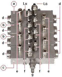 Legend: a=purge block with a connector for Lu=air and a connector for Lö=solvent (top most connector), b=extension blocks, c=outlet block, d=mini valves, e=connectors for pneumatic control, f=material inlets, g=material outlet.