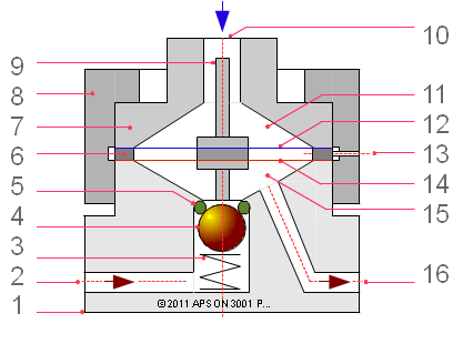 Die Doppelmembrane trennt den Steuerluft-Raum 11 vom Medium-Raum 15. Der Regler hält den Mediumdruck am Ausgang 16 konstant und unabhängig von Druckschwankungen des Medium- Versorgungssystems am Eingang 2 des Reglers, falls der Eingangsdruck größer ist als der pneumatisch voreingestellte Ausgangsdruck.