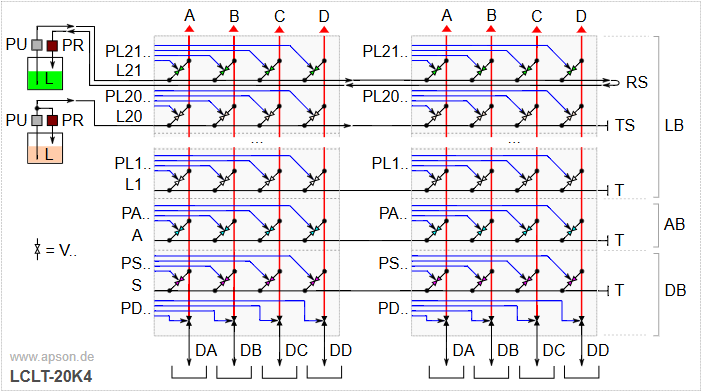 Der APSON LCLT-20K4 besteht aus maximal einundzwanzig 4-kanaligen Schaltblöcken für Lack (LB), einem Lackwechsler-Endblock (spezieller Schaltblock, normalerweise oben) für den Medien-Auslass, und einer Cleaner/Dump Gruppe (normalerweise unten). Die Cleaner/Dump Gruppe besteht aus einem normalen Schaltblock (AB) für die Versorgung mit Luft und einem speziellen Dumpblock (DB) für die Versorgung mit Lösemittel (S) und zum Spülen (Dump oder Rückführung).