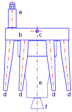 e = Turbinengehäuse, f = Zerstäuberglocke