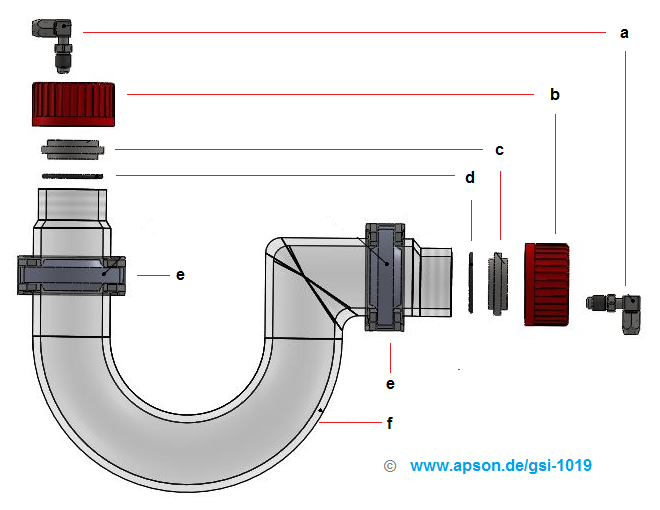 Legende: a = Schlauchverschraubungen, b = Überwurfmuttern, c = Deckel mit Gewinde für Schlauchverschraubung, d = O-Ringe, e = Rohrklemmen, f = Glas-Siphon.