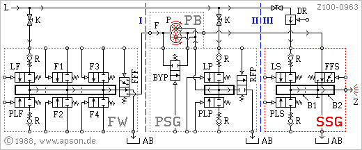 • Sekundärkreise Spülgruppe SSG (Abschnitt III):B1 = Spülblock, B2 = Umschaltblock, LS = Lösemittel Sekundärkreis, PLS = Pulsluft Sekundärkreis, FFS = Farbfreigabe Sekundärkreis