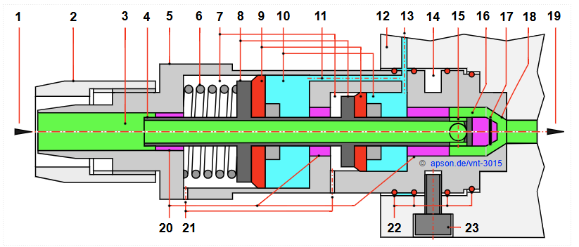 : 1=Eingang für Arbeitsmaterial, 2=Schlauchverschraubung, SL-Mutter, 3=Arbeitsmaterial, 4=Hohlnadel, 5=Ventilgehäuse, 6=Druckfeder, 7=Entlüftungskammern, 8=Kolben, 9=Kolbendichtungen, 10=Druckräume, 11=Steuerluft-Kanal, 12=Ventilblock, 13=Eingang für Steuerdruckluft, 14=Umlaufende Befestigungsnut, 15=Durchgangsbohrungen von Hohlnadel zur Ventilkammer, 16=Ventilkammer, 17=Hauptdichtung des Ventils (zur besseren Verdeutlichung des Arbeitsmaterialflusses ist das Ventil im angesteuerten, offenen Zustand dargestellt), 18=Dichtsitz der Hauptdichtung, 19=Ausgang für Arbeitsmaterial, 20=Hohlnadeldichtungen, 21=Entlüftungsbohrungen, 22=Gehäusedichtungen, O-Ringe, 23=Arretierschraube.