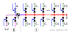Legende: I=Lackwechsler, II=Spülblock/Cleaner, C1 bis Cn = Lackwechsler Blöcke (Color), K=Ausgangskanal, A=Druckluft (Air), S=Lösemittel (Solvent), T=(Turbo-)Mischer, D=Auffang-Behälter (Dump).